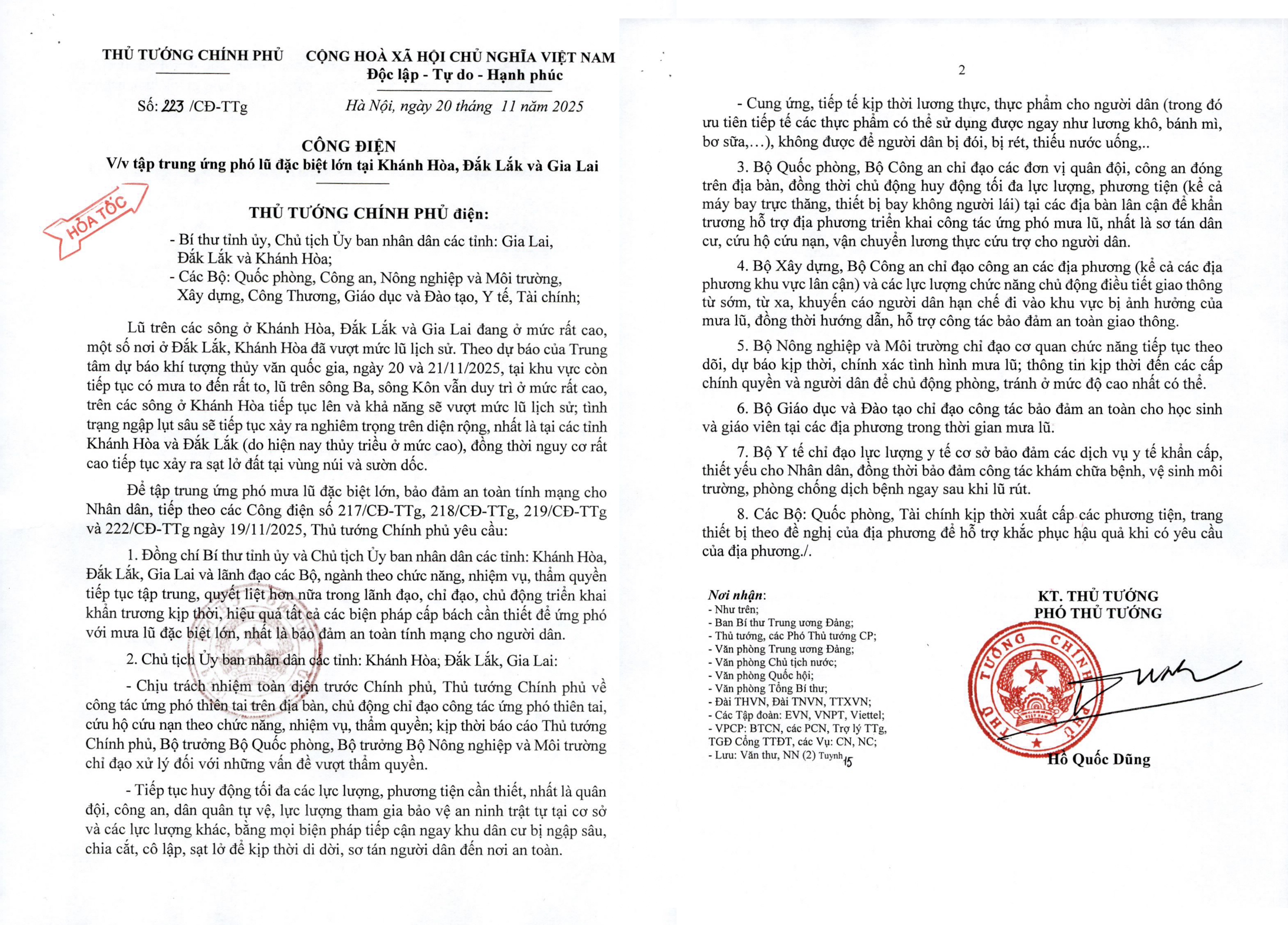 Ngày 20/11/2025, Thủ tướng Chính phủ đã có công điện số 223/CĐ-TTg gửi Bí thư tỉnh ủy, Chủ tịch Ủy ban nhân dân các tỉnh: Gia Lai, Đắk Lắk và Khánh Hòa; Các Bộ: Quốc phòng, Công an, Nông nghiệp và Môi trường, Xây dựng, Công Thương, Giáo dục và Đào tạo, Y tế, Tài chính tập trung ứng phó lũ đặc biệt lớn tại Khánh Hòa, Đắk Lắk và Gia Lai.