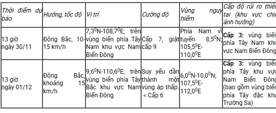 1. Hiện trạng áp thấp nhiệt đới Hồi 13 giờ ngày 29/11, vị trí tâm áp thấp nhiệt đới ở vào khoảng 5,2 độ Vĩ Bắc; 106,7 độ Kinh Đông, trên vùng biển phía Tây Nam khu vực Nam Biển Đông. Sức gió mạnh nhất vùng gần tâm áp thấp nhiệt đới mạnh cấp 6-7 (39-61km/giờ), giật cấp 9. Di chuyển theo hướng Đông Đông Bắc, tốc độ khoảng 15km/h.