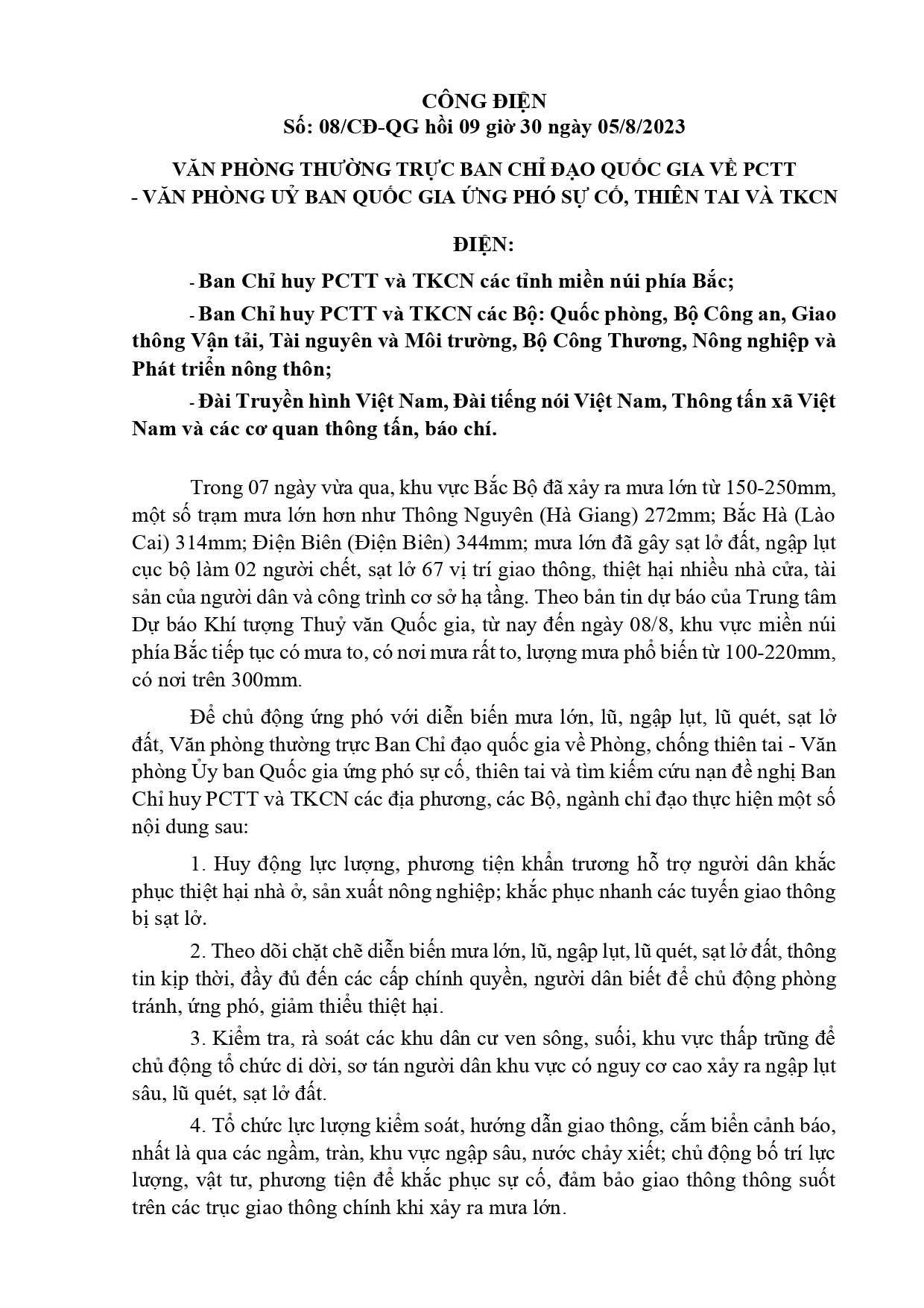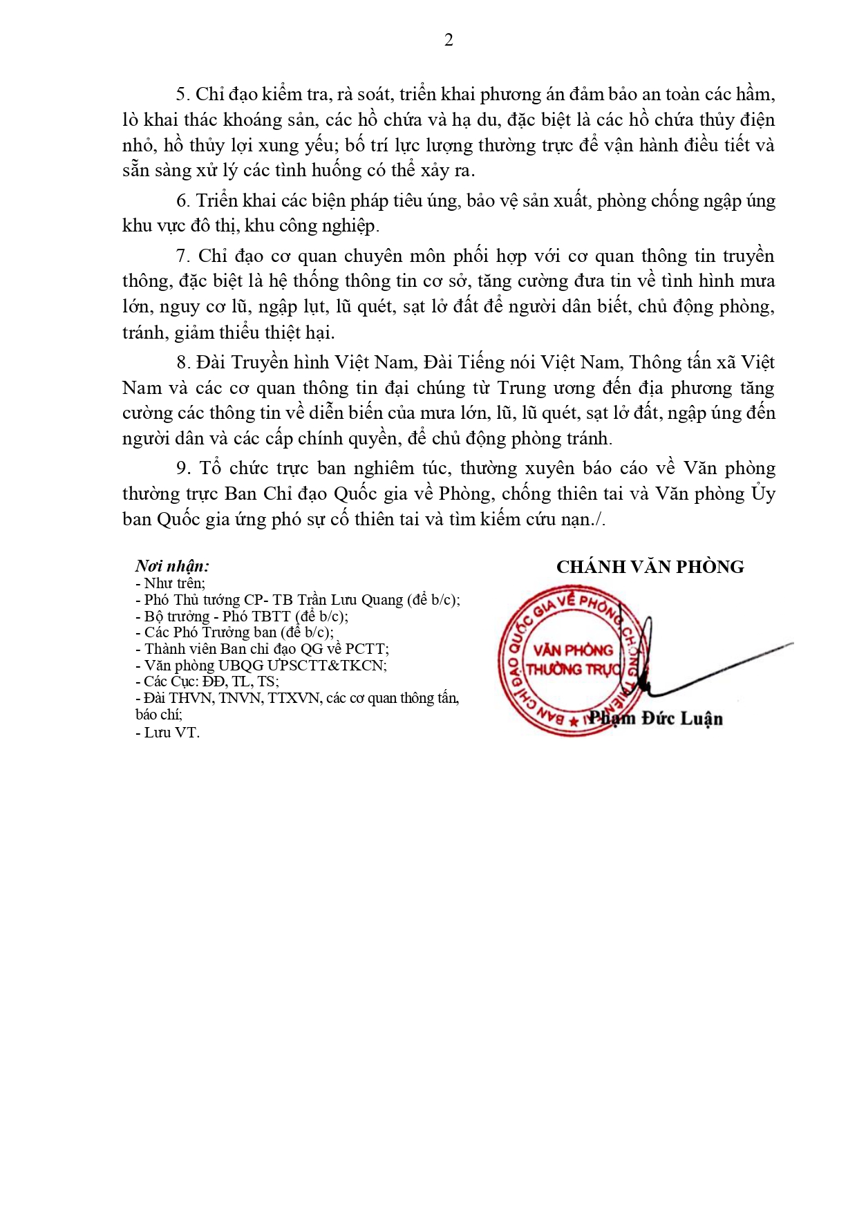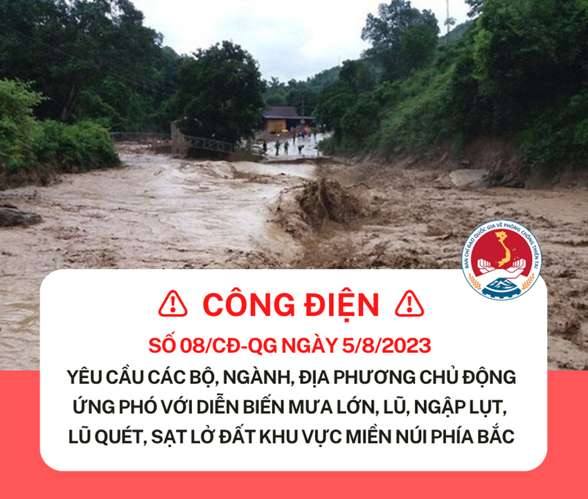 Để chủ động ứng phó với diễn biến mưa lớn, lũ, ngập lụt, lũ quét, sạt lở đất, Văn phòng thường trực Ban Chỉ đạo quốc gia về Phòng, chống thiên tai - Văn phòng Ủy ban Quốc gia ứng phó sự cố, thiên tai và tìm kiếm cứu nạn đề nghị Ban Chỉ huy PCTT và TKCN các địa phương, các Bộ, ngành chỉ đạo thực hiện một số nội dung sau: