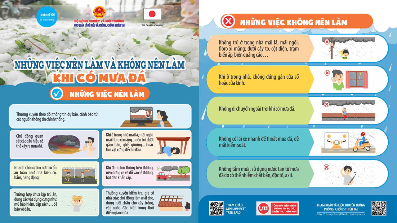 ✅ Hãy ghi nhớ ngay: Theo dõi cảnh báo thời tiết khi có dông mạnh; Tìm nơi trú ẩn an toàn, tránh xa mái tôn yếu, cây lớn; Không ra ngoài khi mưa đá đang xảy ra; Bảo vệ đầu và cơ thể khi di chuyển ngoài trời.