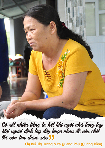 Narrowly escaping from death, Bui Thi Trang of Quang Phu Commune (Quang Dien District) experienced from such fear. Seeing the rising water, 60 people evacuated to the office house of the commune People’s Committee. Two o'clock in the morning, water came in. “There are lots of shouts when the office house was shaken. People tied up together so that if they die, their bodies could be found” Trang said.