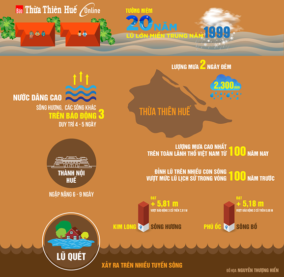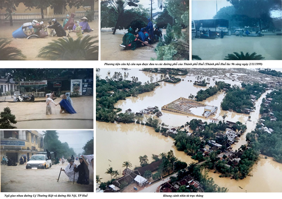 Heavy rains occurred continuosly in 7 days (from November 1-7, 1999) and submerged 90% of the hilly area. On the Perfume River and the Bo river, two big rivers in Hue - the water level sometimes rose to 8-9m.