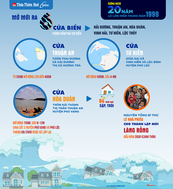 The aftermath of the 1999 flood created an unprecedented event in history: 6 new water fronts appeared in Thua Thien Hue, including ones in Hai Duong (Huong Tra), Thuan An (Phu Vang), Vinh Hai (Phu Loc), Tu Hien (Phu Loc), Loc Thuy (Phu Loc). After the flood, a bold decision was made: to heal the Hoa Duan new water front at Thuan An Beach. August, 2000, nearly 1 year after the flood, this water front was healed and merged and now becoming Highway 498.